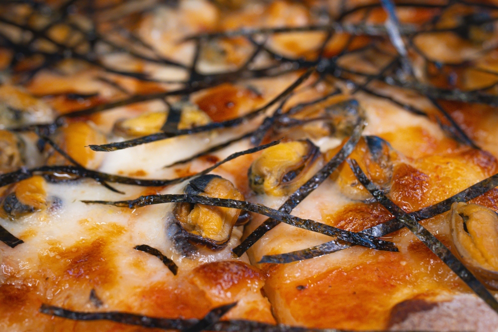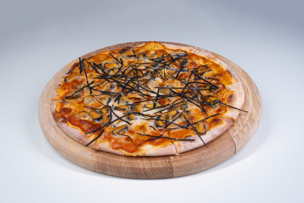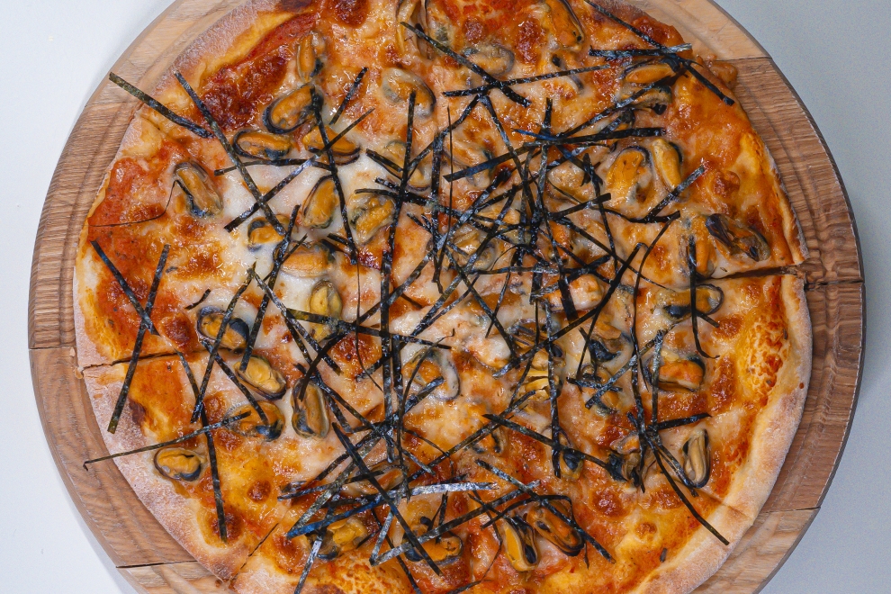 соус томатный, соус бешамель, мясо мидий, водоросли нори, масло чесночное, сыр моцарелла