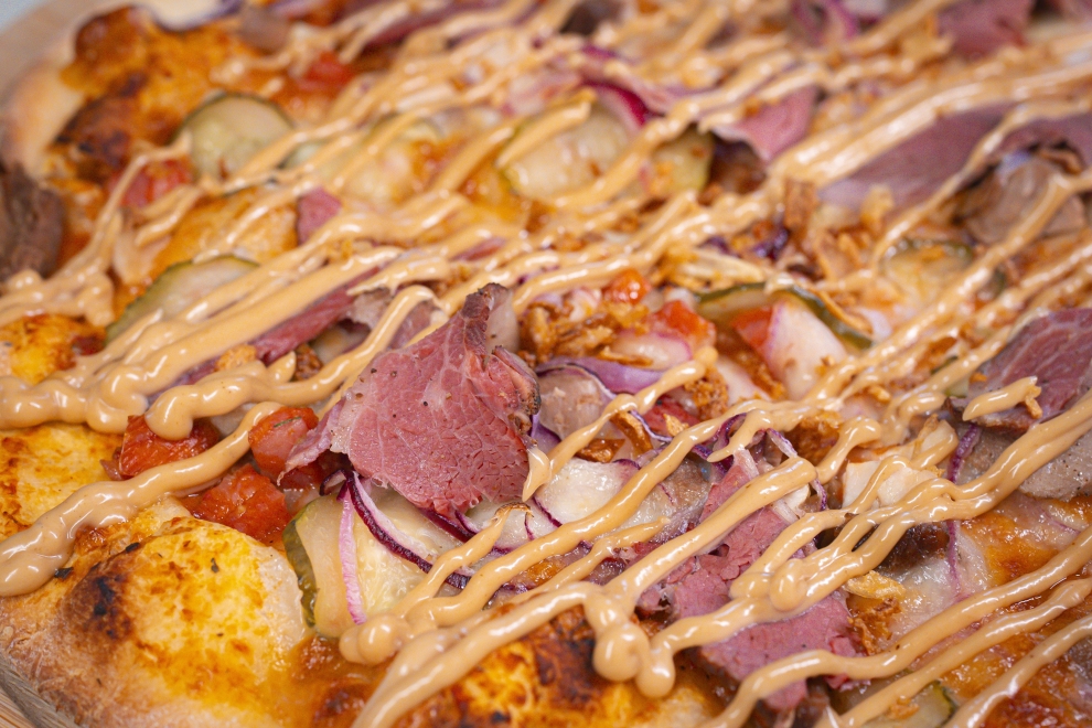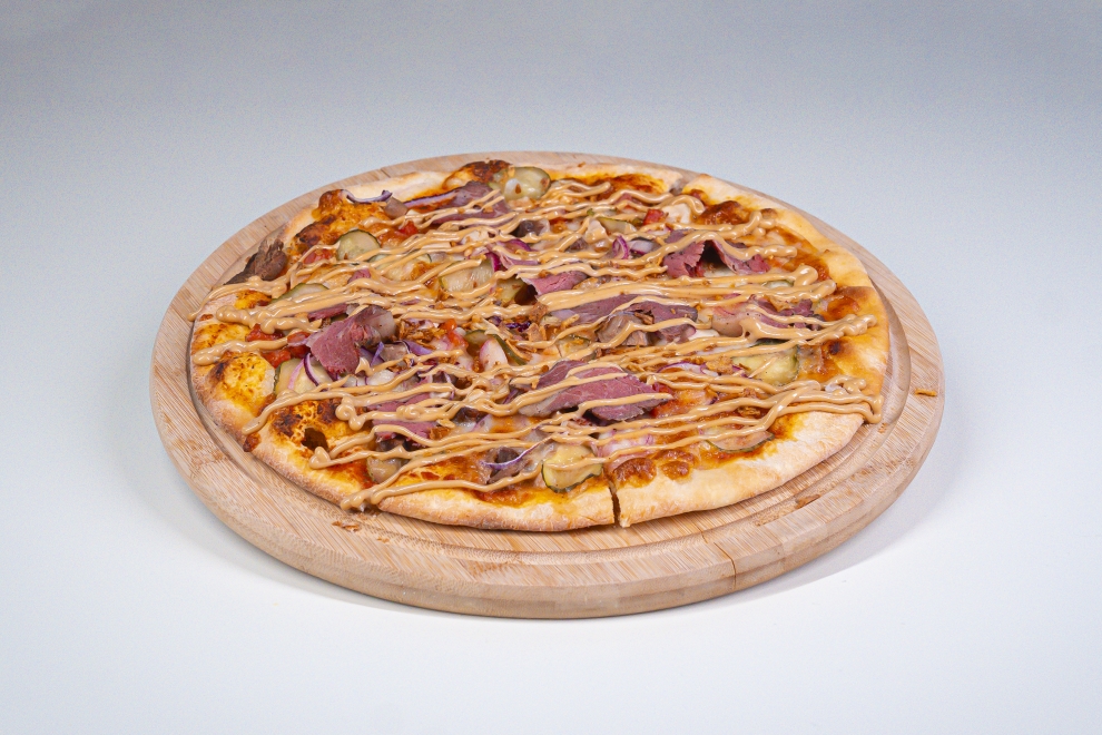 соус томатный, пастрами, чоризо, язык говяжий, куриное филе, утиная грудка, огурцы маринованные, лук красный, лук фри, сыр моцарелла