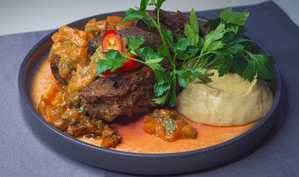 Тушеная телячья голяшка с пюре из цветной капусты.