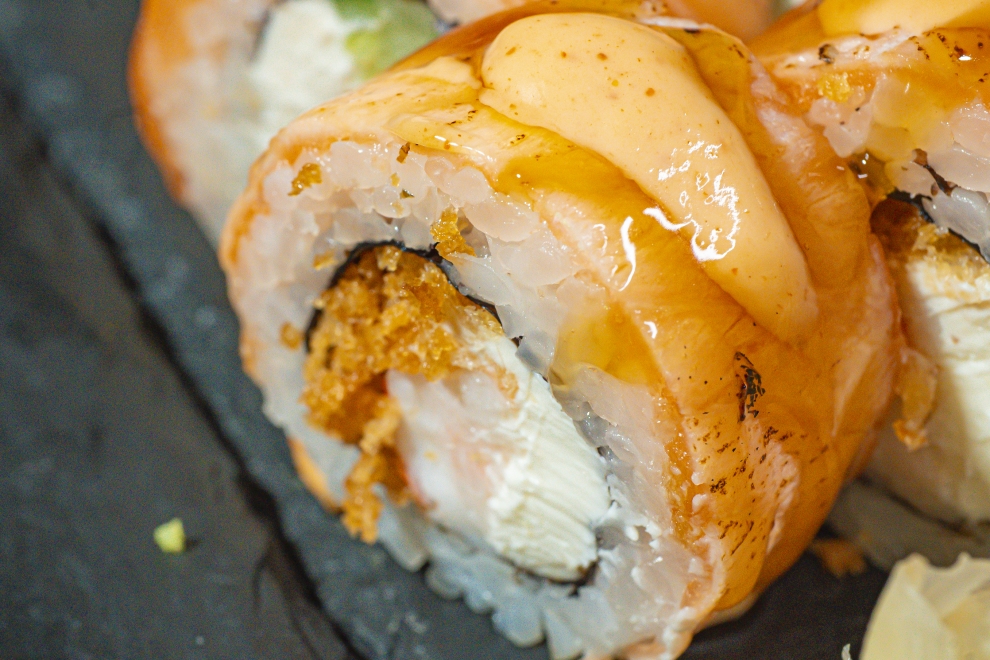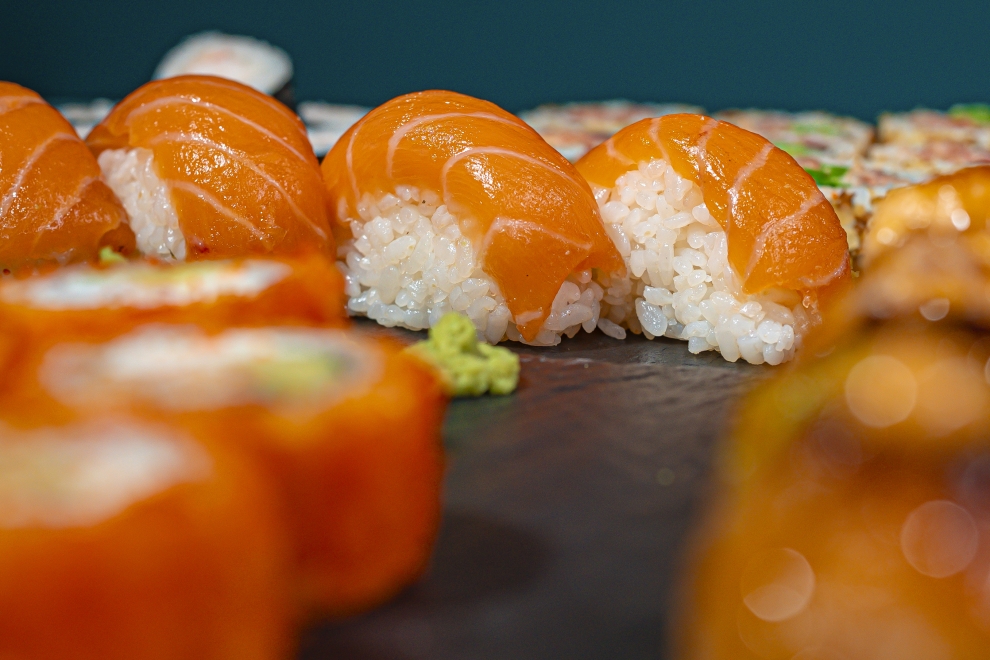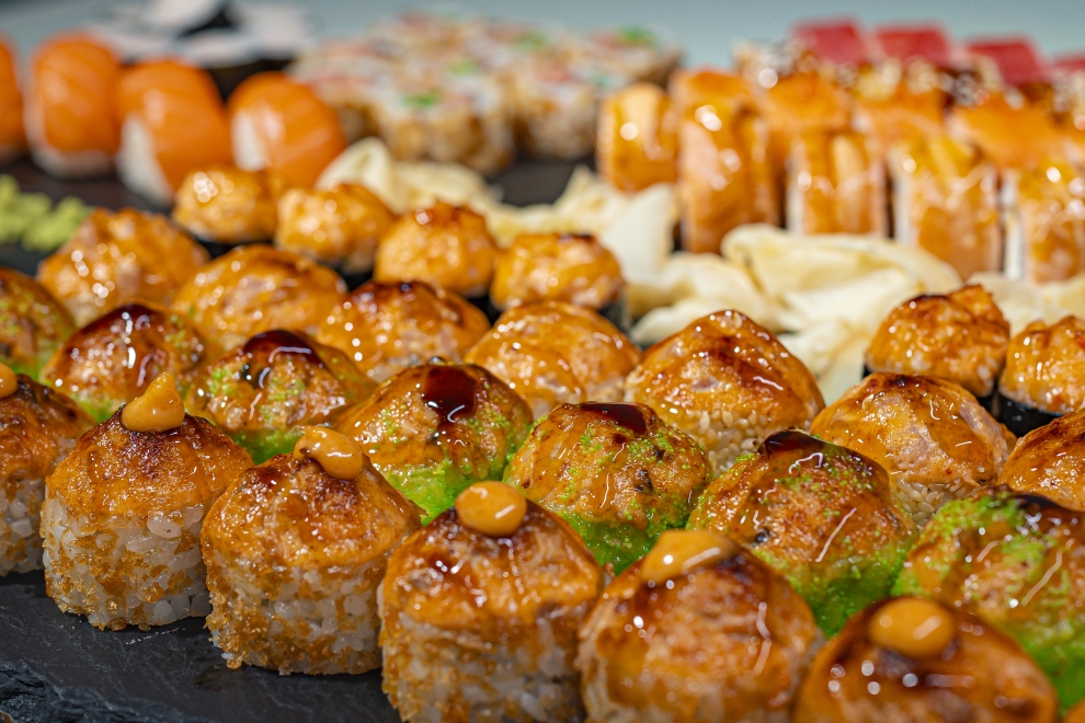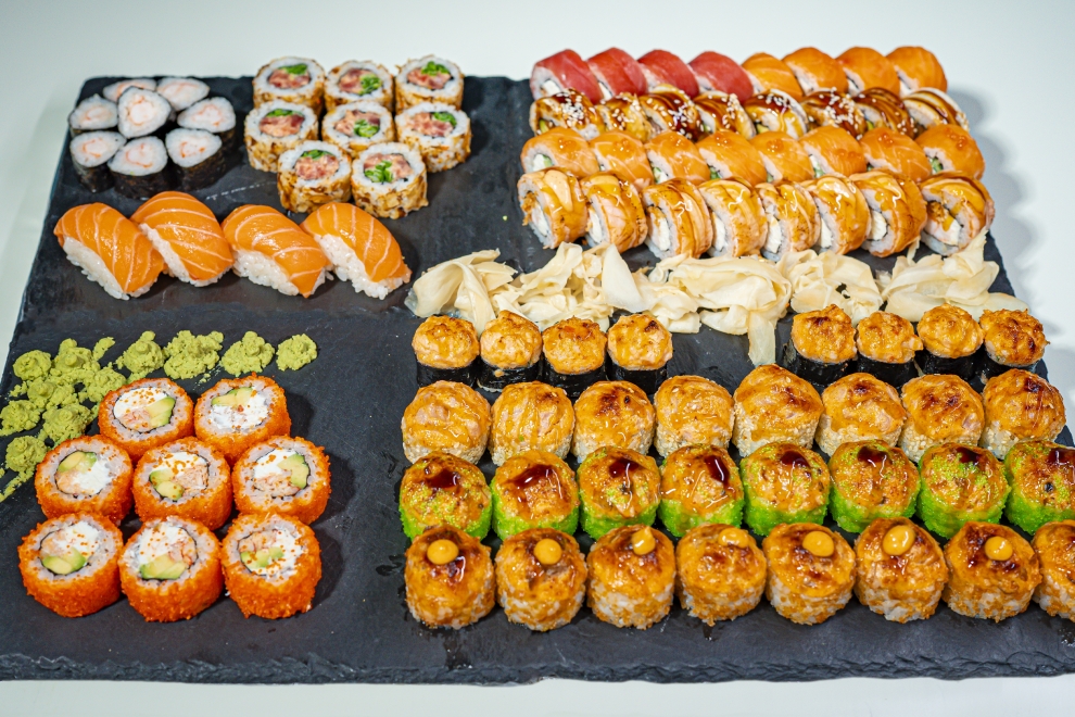 Ролл запеченный с тунцом + Ролл филадельфия + Ролл калифорния + Ролл канада + Ролл суперфиш + Маки с креветкой + Ролл с тунцом спайси + Ролл с опаленным лососем + Микс запеченных роллов + Запеченный ролл с жареным лососем + Запеченный ролл с угрем + Нигири с лососем -4 шт.